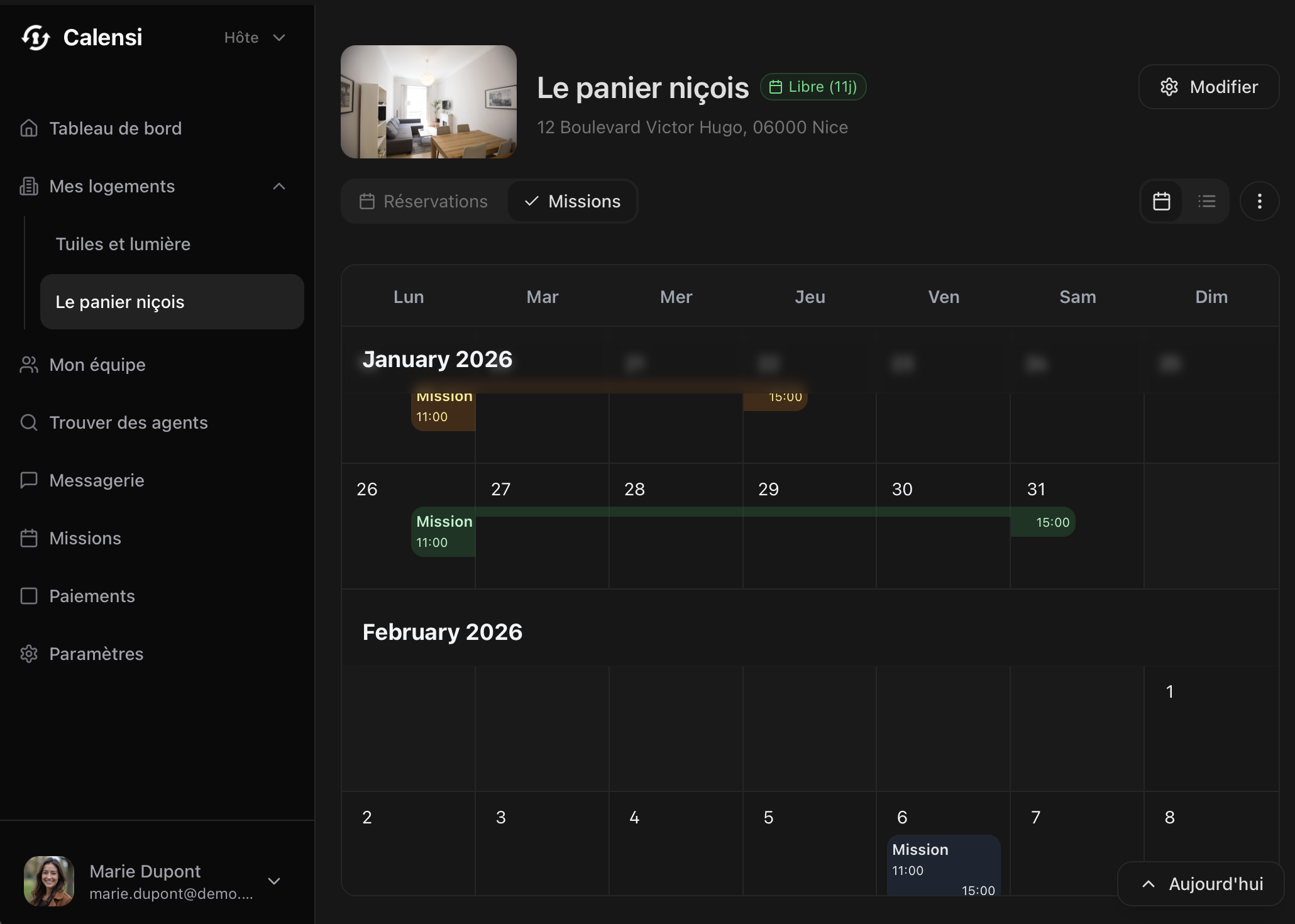 Calensi détecte la réservation, crée la mission de nettoyage et l'assigne automatiquement à votre agent selon vos règles.